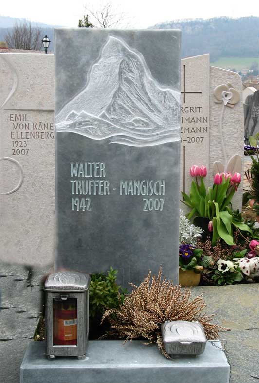 C-39 Matterhorn als Bas-Relief auf geschliffenem Marmor Alle Entwürfe sind unser geistiges Eigentum und durch Bundesgesetz gesetzlich geschützt. Unerlaubtes Kopieren ist Diebstahl von geistigem Eigentum und wird gerichtlich verfolgt. Bildhauer können bei uns eine Lizenz lösen, die zur Ausführung einzelner Entwürfe berechtigt. Die Lizenz ist auf jeden Fall schriftlich unter Angabe des Friedhofs vor Ausführung des Grabmals anzufordern. Lizenz wird nur erteilt, wenn der Stein noch nicht auf dem gewünschten Friedhof steht.