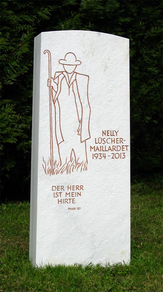 C-73 Crevola Marmor, Vorderfläche geflammt, Umlauf matt geschliffen Der Herr ist mein Hirte, eingraviert und patiniert