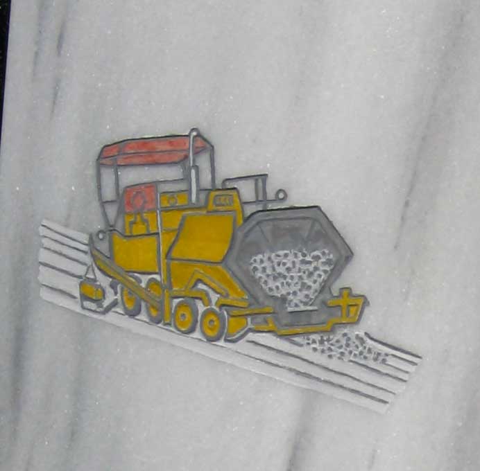 T-024a Belag-Einbaumaschine als plastische Gravur, patiniert. Material O'Nil hell Marmor Alle Entwürfe sind unser geistiges Eigentum und durch Bundesgesetz gesetzlich geschützt. Unerlaubtes Kopieren wird gerichtlich verfolgt. Bildhauer können bei uns eine Lizenz lösen, die zur Ausführung einzelner Entwürfe berechtigt. Die Lizenz ist auf jeden Fall schriftlich unter Angabe des Friedhofs vor Ausführung des Grabmals anzufordern. Lizenz wird nur erteilt, wenn der Stein noch nicht auf dem gewünschten Friedhof steht.